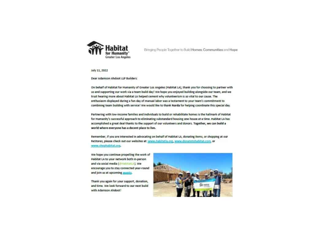 Our team does more than just work together in the office. We make sure to take the time to commemorate beautiful moments and celebrate them as well. We also make sure to help those in our surrounding communities through our outreach team, because the Adamson Ahdoot team comes from that community itself.